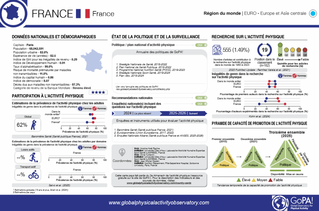 Face aux enjeux de santé publique que sont la promotion de l’activité physique et la lutte contre la sédentarité, les territoires sont de plus en plus encouragés à engager des actions sur ces thématiques. En effet, les territoires sont au plus près des populations et leurs caractéristiques, leurs politiques, leurs offres ont un impact sur les comportements, les pratiques, les perceptions, les freins, les leviers et les modes de vie.